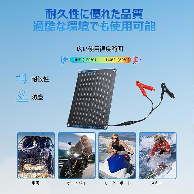商品名:Nicesolar 車 ソーラー充電器 10W ソーラーパネル 12V ソーラーバッテリー充電器 単結晶 IP68防水 自動車 バイク トラクター ボートのバッテリーへの補充電 メンテナンス