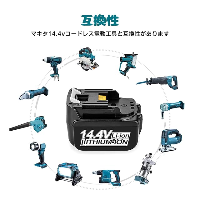 完全互換:マキタ14.4V電動工具バッテリーBL1430B、BL1460B、BL1430、BL1440、BL1450、BL1460、194065-3、194066-1など完全対応。対応充電器:DC18RC、DC18RA、DC18RDなど。対応機種:PT350D、V140D 、UB142D 、VC340D、DA340D 、HR162D 、TW152D 、UC121D 、MUH351D 、TD134D、TD136、TD133D、TD132D、TD131D、TD135D 、FS440D、FR440D 、TP130D 、DF445D 、DF440D 、LC540D 、GA400D 、HP440D 、KS52 、TS130D 、TL060D 、CS540D 、VR340D、VR440D 、SS540D 、JS160D 、ST110D、ST420D、ST120D