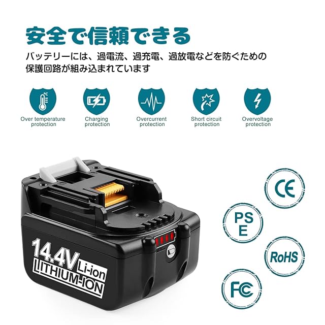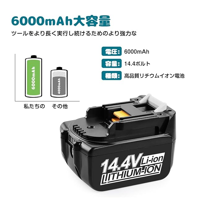 特徴:LED残量表示+大容量。確認ボタンを押したら、4段階の残量が見えます、とっても便利です。6000mAh大容量で、長い時間作業が实现します。品質は軽いリチウムイオンバッテリーので高容量ながら小型、軽量が実現できる。互換マキタ14.4vバッテリー純正と同じように充電、使用できます。メモリ効果がないため、継ぎ足し充電も可能になりました。バッテリーは高品質の ABS 素材で作られており、マキタ 14.4V 電動工具と完全に互換性があり、プラグの抜き差しが簡単です。