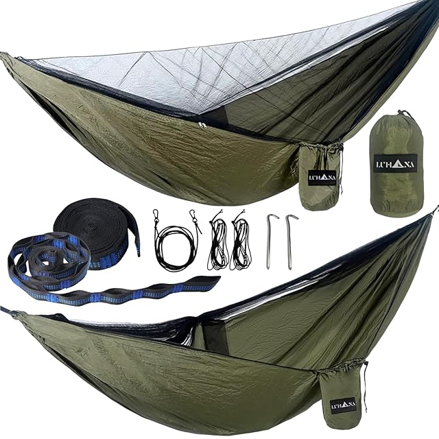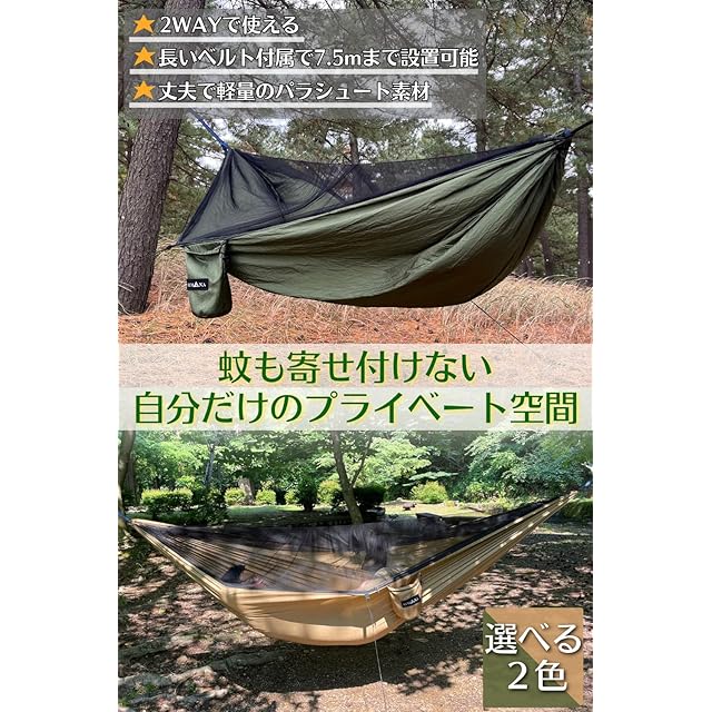 商品名:【日本ブランド】LUHANA (ルハナ) ハンモック 蚊帳 付き キャンプ 軽量 ベルト長3m ノード16個 選べる3色 アーミーグリーン