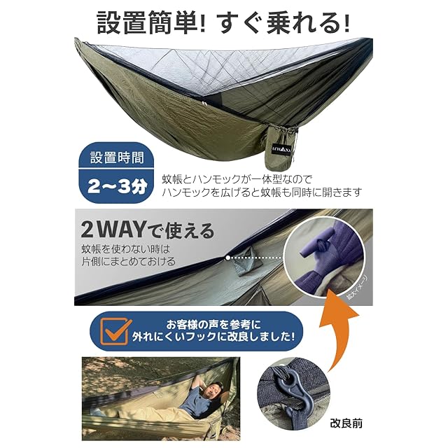 【✅蚊帳付きだから虫を寄せ付けない】蚊帳と一体型のハンモック。ハンモック展開時に自動で蚊帳も開くため、セパレートタイプと比べて大幅に設置時間を短縮できます。蚊帳不要時はフックでまとめることも可能です。