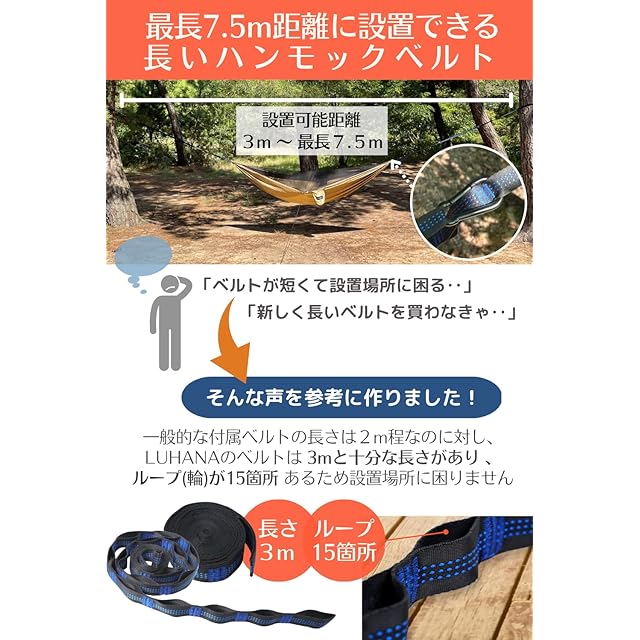 【✅設置できる範囲が広い!】付属のハンモックベルトは3mと他製品より長く、ループは15個なので、設置できる範囲がとても広いのが最大の特長です。コンパクトに折り畳んで収納袋にしまえるので持ち運びも楽々。