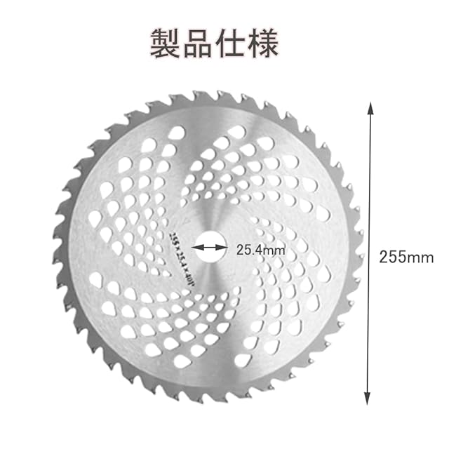 【サイズ】外径約255mm×内径約25.4mm×刃厚約1.5mm、刃数:40P 、重量:約338g/1枚あたり。ご購入前に草刈機のサイズをご確認ください。
