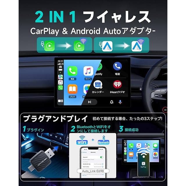 【接続する方法】ワイヤレスCarPlay:①本商品を有線Carplayが内蔵される車のUSBポートに挿入します。②iPhoneのWIFIと Bluetoothをオンにし、カーナビ端末に表示されるBluetooth名称を検索し、ペアリングします。③数秒後、接続成功します。Carplayの画面に入って、使用し始めます。ワイヤレスAndroid Auto:①製品を有線Android Autoが内蔵される車のUSBポートに挿入します。②スマホのWIFIと Bluetoothをオンにし、カーナビ端末に表示されるBluetooth名称を検索し、ペアリングします。③数秒後、接続成功します。Android Autoの画面に入って、使用し始めます。