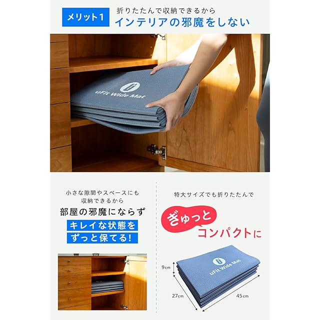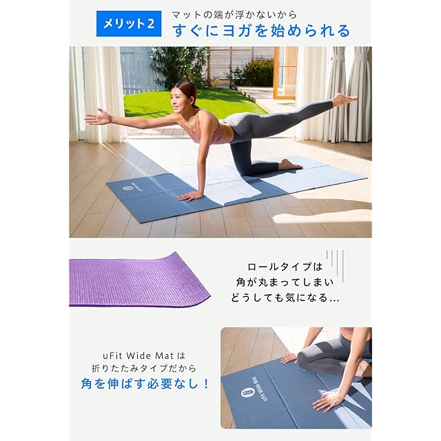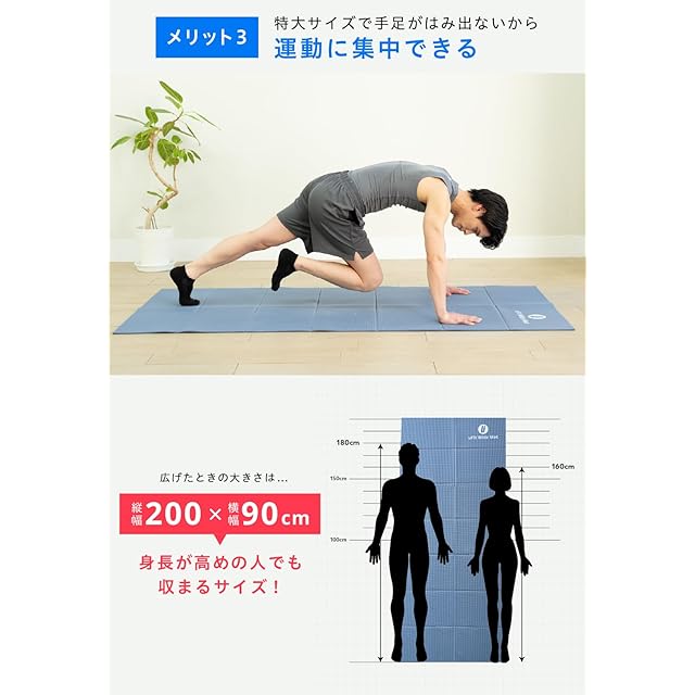 【200×90cmの幅広サイズ】uFit Exercise Matは、広げると縦200cm、横90cmの特大サイズになります。高身長の方でも、手や足がはみ出ることなく快適に筋トレやヨガをすることができます。