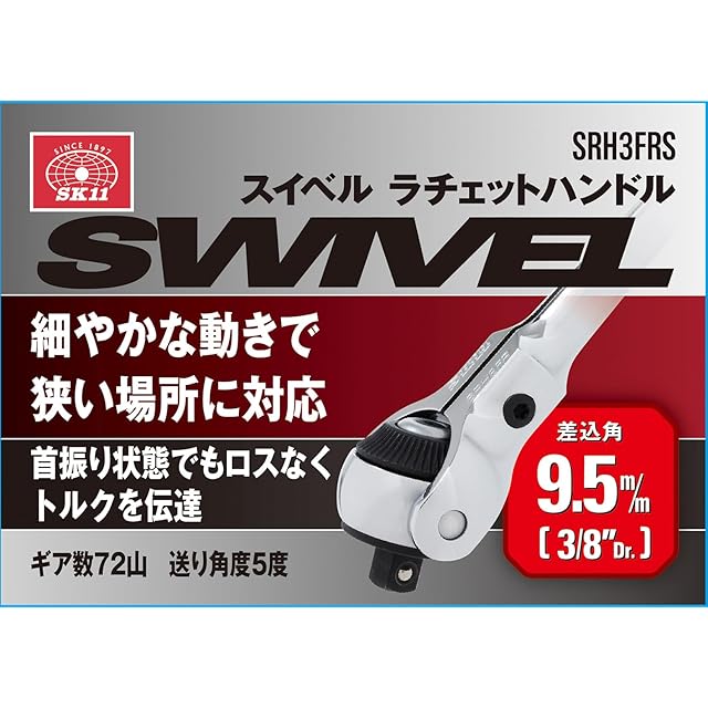 商品名:SK11(エスケー11) スイベルラチェットハンドル 差込角 9.5mm 3/8インチ SRH3FRS 72山ギア 全長150mm