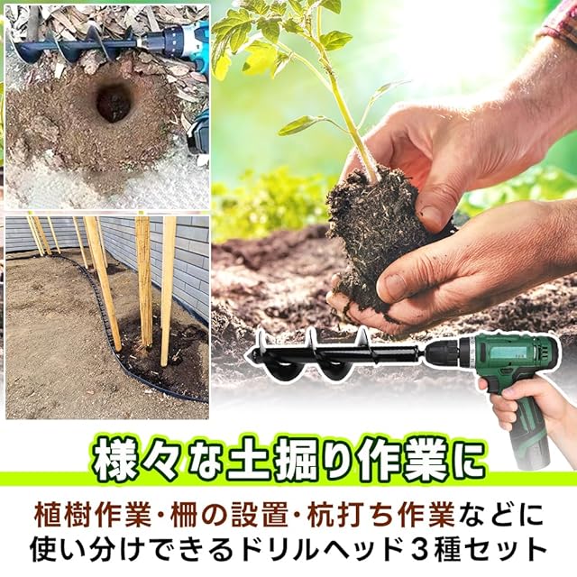 商品名:【現役園芸師が推薦】 園芸用アースドリル 3サイズセット 穴掘り 園芸 穴あけ器 電動工具 DIY 農業 オーガードリル ビット (ロングセット)