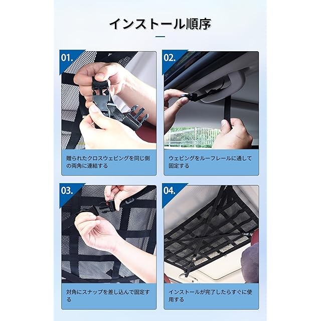 【取り付けが簡単】4点固定で、固定バンドを4つの手すりに通すだけで取り付け完了! ルーフ収納ネットは調整機能付きの固定バンドなので、長さを調整することができ、工具を必要とせず、4つのハンドルに簡単に固定できます。 3本の手すりがあります。