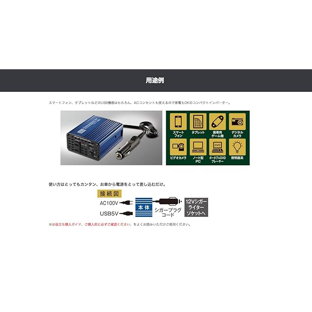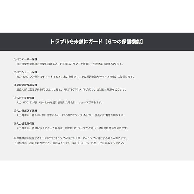 入力電圧:DC12V(動作電圧範囲12.0V~14.5V) 出力電圧:AC100V