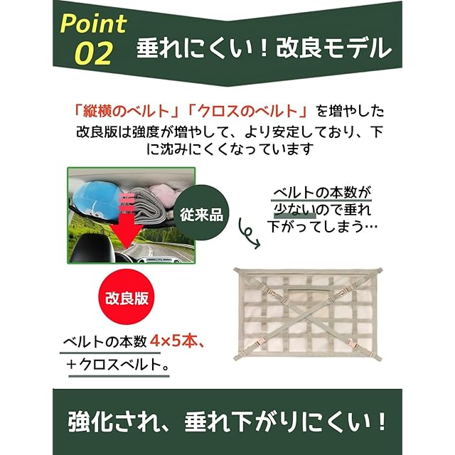 【ご注意】①本製品は軽い物の収納に適しています。最大重量は7kgです。重い物やネットが破損する恐れのある物、万一落下した場合に乗員がケガをする可能性のある物は収納しないようご注意ください。②天井の高い車種に適しています。天井が低い車種の場合、視界を遮る可能性があるため、ご購入の際はご注意ください。③ご利用のモニター環境により、ベージュの色合いが実物と若干異なって見える場合がございます。製品に関してお困りな事や不具合等がございましたら、弊社は全力で対応させていただきます。是非お気軽にお問い合わせください。