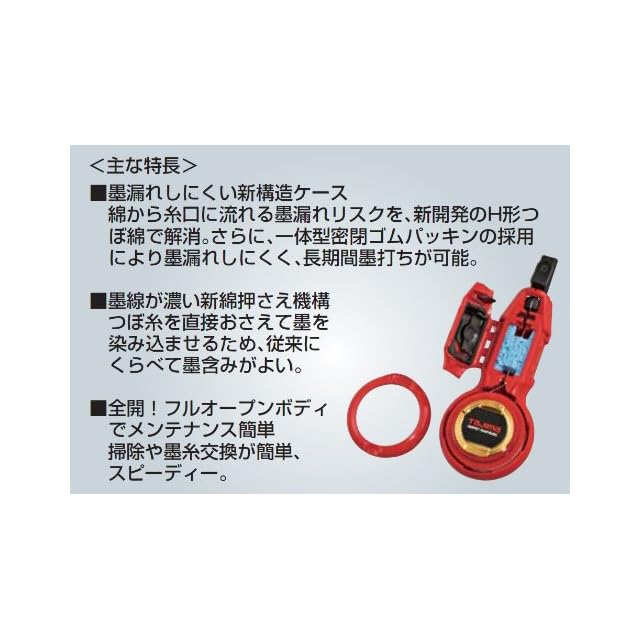 ●押さえやすく、先端が見やすい斜めカットカルコケースを採用しています●ゴムパッキンを要所に使用し、墨もれしにくく墨汁の乾燥を防ぎます●墨含みを飛躍的に向上させたセルロース・スポンジ綿採用です●本体が工具なしで全開し、手入れや糸交換が簡単にできます●墨汁による墨付け作業●糸長さ(m):20●自動巻取糸長さ(m):10●色:黒●全長(mm):170●糸径(mm):0.6●墨タンク最大容量(ml):16●自動巻●付属カルコ:糸巻取り時、針が自動的に収納する「ポイントカルコ」●外装:ABS樹脂●糸:ナイロン●※こちらの商品はご入金後のキャンセルは承れませんので予めご了承ください。