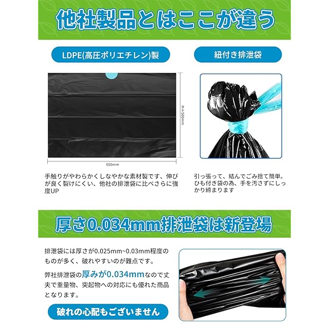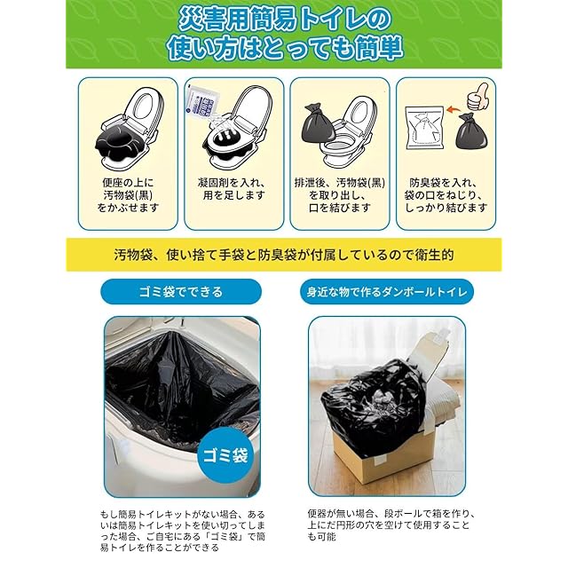 【ひも付き排便袋付き】汚物袋はひもが付いているので、手を汚さずに楽に結べるんです。【厚手で丈夫な0.034mm】弊店の0.034mm(片面0.034mm)厚み汚物袋があり、破れにくくなっています。他社汚物袋には、片面0.025mm~0.03mm程度の薄いものが主流になりつつありますが、0.034mmの厚みがあるものを選ぶと安心感があります。排便袋寸法:幅65cmx縦50cm(容量:約28L)厚み:片面0.034mm 防臭袋のサイズ:幅80cmx縦65cm(容量:約50L)厚み:片面0.03mm【断水でもトイレは待ったなし】震災や台風などによって断水してしまった場合、水洗トイレを使うことができなくなります。そんな時のために備えておくべき防災グッズが「簡易トイレ」です。水が使えない状況でも汚物袋をかぶせるだけで用を足すことができます。簡易トイレ使用後に凝固剤をふりかけるだけ、ジェル状に固まりゴミとして廃棄可能です。いざという時、食事は我慢できても、トイレは我慢できません!防災備蓄の中でも重要になってくるものが簡易トイレになります。災害への備えを考えるにあたって、簡易トイレを備えよう。