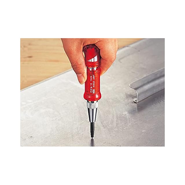 ●自動車のオプション部品取付け時の印付け、板金作業でのパネルのひずみ取り。<br>●嵌合部品の合いマーク表示等。<br>●ポンチ部は耐磨耗性に優れたSK材を使用。<br>●連続使用が可能ですので作業性が良くなっています。<br>●ハンマを使わず片手で素早くポンチマークが打てます。<br>●ハンドルを左右に回すだけで打ち込み強さの強弱調整ができます。強く打つ場合、右回転。弱く打つ場合、左回転。(反時計方向)