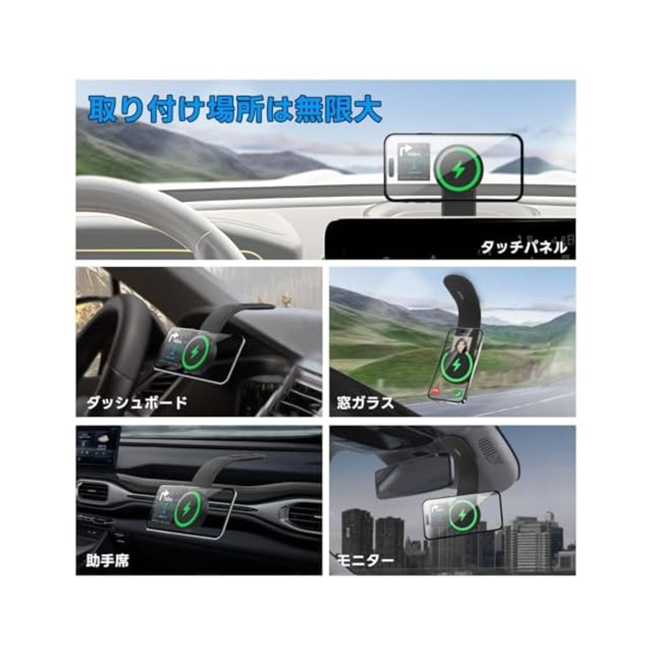 【粘着力抜群・3Mテープ】スマホホルダーはマジックテープと3Mテープで革新的取り付け方法でタッチパネル・ダッシュボード・窓・助手席など、様々な場所に取付可能で無限大な設置場所が実現します。運転の習慣により適合な位置を選んできます。3Mテープは高温60℃から低温-10℃まで対応可能な耐候性があり、跡が残せずに取り外せます。