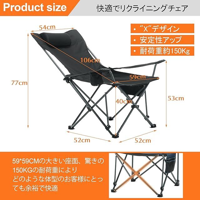 【人間工学デザイン&耐荷重】 背もたれは人間工学に基づいて、頭、臀部、背中を支えるように設計されており、横になっているときに余暇を楽しむことができます。 製品の耐荷重性能は高水準でテストされ、145kgの耐荷重確保されています。どんな状況においても、信頼性と安心感を持って使えるアウトドア椅子です。