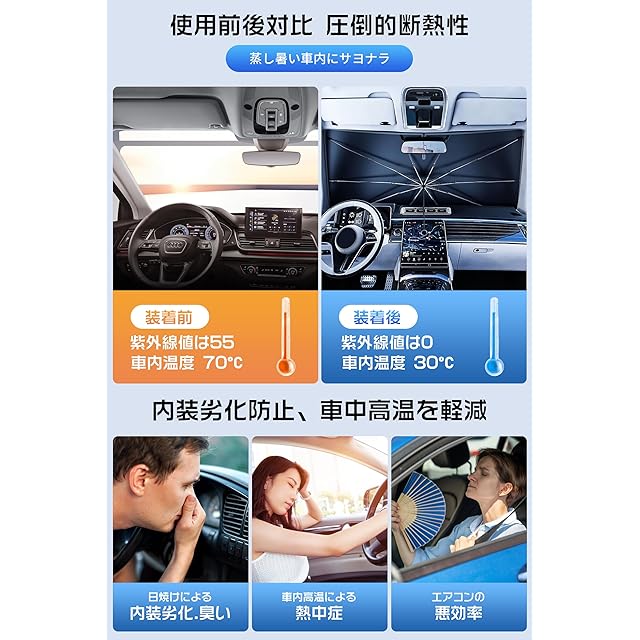 【6層ポリマー断熱&UVカット99.9%】このフロント 車用サンシェード の傘面は6層ナノ高分子断熱材料を採用し、外側はチタンシルバーコーティングで、UVカット率は99%以上、紫外線、赤外線、太陽光から効果的に保護します。強い日差しを反射して車内温度の上昇を抑えますので、外気温が上昇しても駐車中の車内を涼しく暑から守ります。 車を駐車するたびに涼しさを保ちます。また、日焼けで車の内装劣化と損傷を防ぎ、エアコンへの負荷が減られ、省燃費になります。光の眩しさを抑え、車内の温度を下げることで、昼寝中に快適な環境を提供し、車中泊にも利用できる。</p>