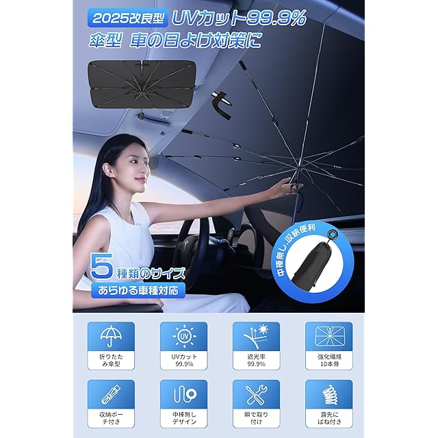 【2025最新中棒無しデザイン&頑丈な10本骨】この車サンシェードは繊維複合素材の十本骨を採用し、柔軟性と強度を併せ持つ、普通のより耐久性に優れて最強の安定性を実現します。最新な中棒無しのデザインで、取り付け時、金属の傘柄が車のダッシュボードと内装などに傷をつける心配ありません。また、中棒ないため、市販のほかの車用サンシェードと比べてもっと軽量化、持ち運び便利です。柄を曲げていると畳めない心配もなくなります。</p>