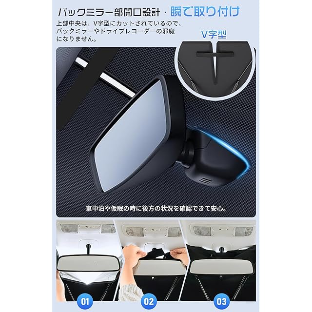 【 瞬で取り付け&ミラー露出デザイン】サンシェードの上部中央に切れ目があるので、ご使用の際に、フロントガラスから延びるルームミラーを切れ目に通しマジックテープ止めの紐で塞ぎられます、サンシェードの落下を防止します、隙間を減少させることができ、日除け効果を向上させることができる、バックミラーやドラレコに干渉しない、使用にも便利です。一人でスムーズに数秒で設置できます。使用後に付属の収納袋に入れ、ドア収納ボックスに入れることができます。</p>