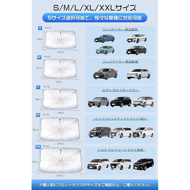 <p>【6層ポリマー断熱&UVカット99.9%】このフロント 車用サンシェード の傘面は6層ナノ高分子断熱材料を採用し、外側はチタンシルバーコーティングで、UVカット率は99%以上、紫外線、赤外線、太陽光から効果的に保護します。強い日差しを反射して車内温度の上昇を抑えますので、外気温が上昇しても駐車中の車内を涼しく暑から守ります。 車を駐車するたびに涼しさを保ちます。また、日焼けで車の内装劣化と損傷を防ぎ、エアコンへの負荷が減られ、省燃費になります。光の眩しさを抑え、車内の温度を下げることで、昼寝中に快適な環境を提供し、車中泊にも利用できる。</p> <p>【2025最新中棒無しデザイン&頑丈な10本骨】この車サンシェードは繊維複合素材の十本骨を採用し、柔軟性と強度を併せ持つ、普通のより耐久性に優れて最強の安定性を実現します。最新な中棒無しのデザインで、取り付け時、金属の傘柄が車のダッシュボードと内装などに傷をつける心配ありません。また、中棒ないため、市販のほかの車用サンシェードと比べてもっと軽量化、持ち運び便利です。柄を曲げていると畳めない心配もなくなります。</p> <p>【折畳み式傘型&露先が折れる】この傘型車用サンシェードは、傘を開くようにセットするだけの簡単装着!ガラスと接触する四隅にプラスチックの保護カバーで被って傘骨の露先にばね付きの二重保護設計で、1~6cmのサイズを調可能、車のフロントガラスに完全にフィットします。内装に傷をつける心配なく、フロントガラスのサイズに合わせて安心して設置できます。</p> <p>【 瞬で取り付け&ミラー露出デザイン】サンシェードの上部中央に切れ目があるので、ご使用の際に、フロントガラスから延びるルームミラーを切れ目に通しマジックテープ止めの紐で塞ぎられます、サンシェードの落下を防止します、隙間を減少させることができ、日除け効果を向上させることができる、バックミラーやドラレコに干渉しない、使用にも便利です。一人でスムーズに数秒で設置できます。使用後に付属の収納袋に入れ、ドア収納ボックスに入れることができます。</p> <p>【車種専用】トヨタ アルファード ヴェルファイア 30系 Alphard Vellfire (2015年~現行) 車種専用 全グレード対応、専用モデルのデザイン、サイズはちょうどいいです。フロントガラスの曲面が異なるため、取り付け後にフロントガラスの両側に隙間が生じる場合があります。</p>