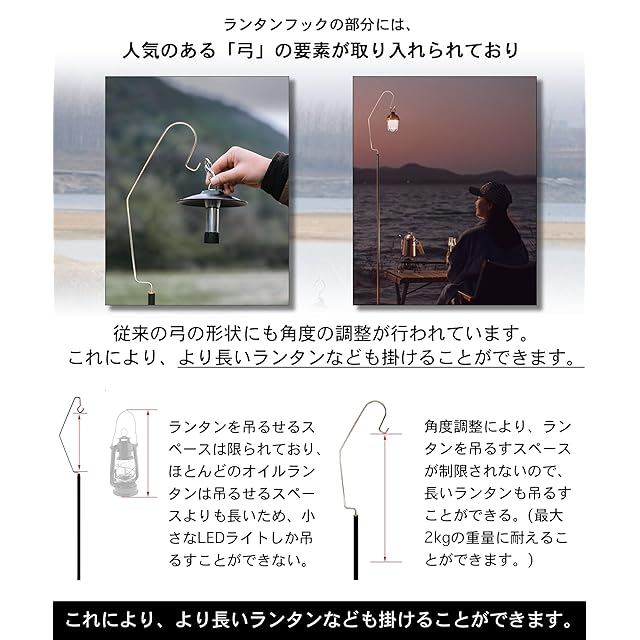 【よりおしゃれなデザイン】ランタンフックの部分には、人気のある「弓」の要素が取り入れられており、従来の弓の形状にも角度の調整が行われています。これにより、より長いランタンなども掛けることができます。最大2kgの重量に耐えることができます。ランタンスタンドの収納サイズは38×10×4cmで、キャンプの荷物にコンパクトに収納できます。