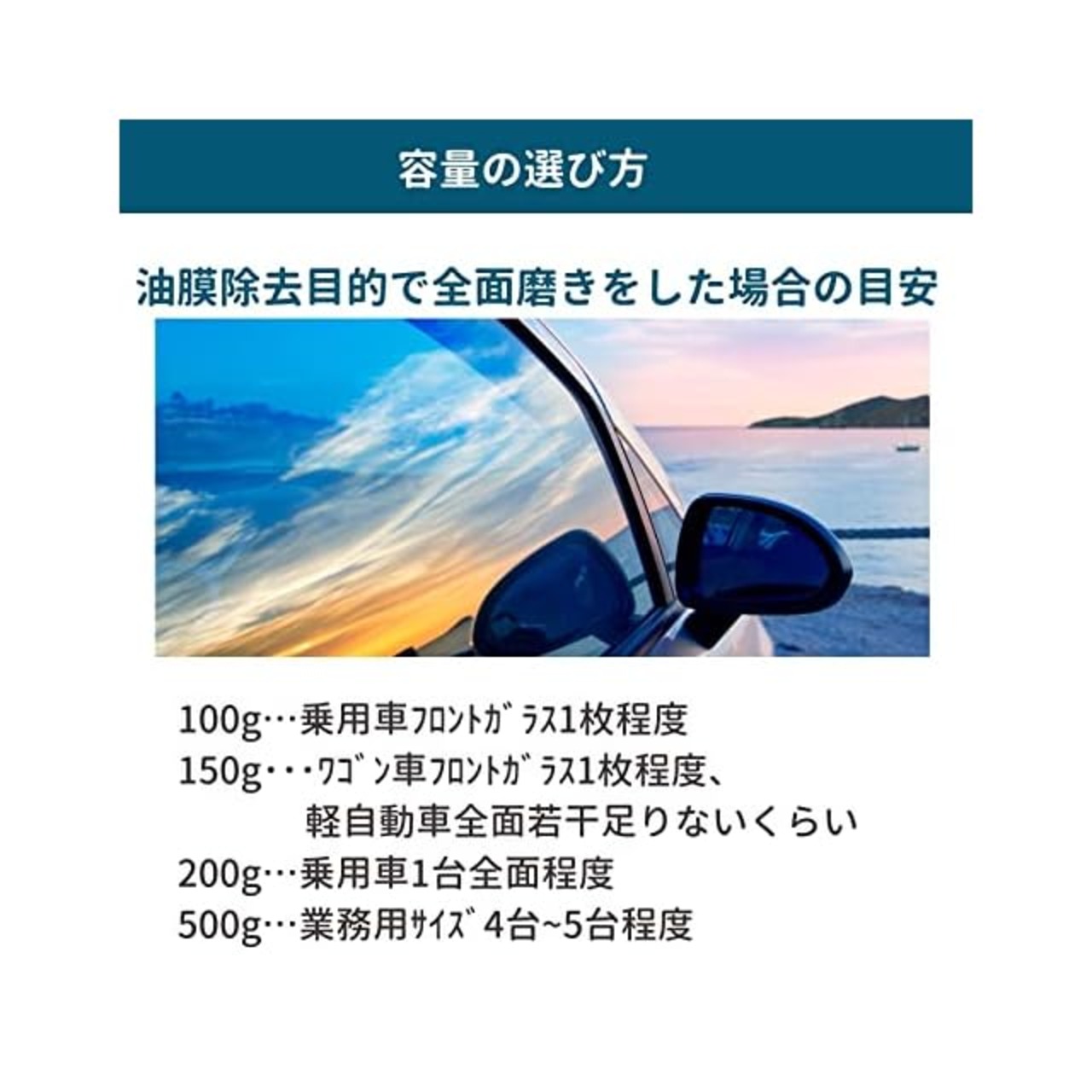 【使用方法】必ず使用前にガラス面を洗車しゴミや汚れを完全に取り除いて下さい。ゴミや汚れがのこったままの状態で磨きますと傷の原因となります。必ず下処理を行ってから作業を始めて下さい。専用スポンジに適量を塗布し、全体的にしっかり磨いて下さい。