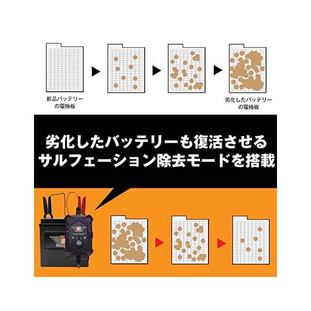 全自動診断による最大60分間のサルフェーション除去(回復充電モード)搭載。パルス充電でサルフェーションの除去を試みます。 ※過放電の状態で長期間放置されたバッテリーは、内部が損傷していることがあります。 その場合、当充電器でバッテリーの損傷は回復しません。また、著しく電圧が低下しているバッテリーは回復不可です。