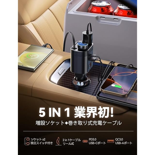 【5-in-1多機能車載充電器】 シガーソケット 増設で2連のシガーライターソケットを搭載します。さらに1本の巻き取り式Type-C to Lightning充電ケーブル、1つのUSB-Cポート、1つのUSBポートを備え、最大5つのデバイスを同時に使用可能です。これ1台あれば、車中のスマホもすべてのデバイスも同時充電OK!さらに、巻き取り式ケーブルで車内を美しく保つだけでなく、使用後もスッキリ収納できます。