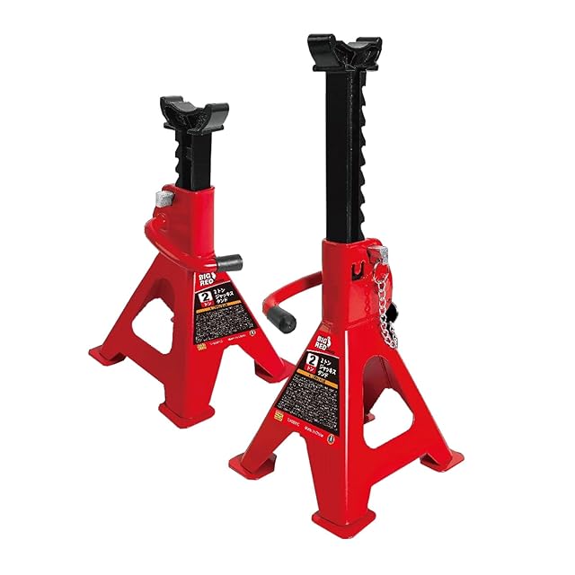 BIG RED ジャッキ スタンド リジットラック 馬ジャッキ 耐荷重2t 高さ10段階調整可能 最低位268mm/最高位418mm ラチェット式 車整備 タイヤ交換 2個セット レッドスチール。 自宅の車メンテナンスに欠かせない製品!タイヤ交換やオイル交換などの作業時には欠かせないジャッキスタンドです。ジャッキスタンドは丈夫な高品質の鍛造鋼を使用し、溶接されたフレーム設計と防錆コーティングにより耐久性を高めています。ジャッキアップした車を支えるジャッキスタンドは4脚マットの設計で安定感を与えます。馬ジャッキの最大耐荷重は2トン、小型の個人車、オフロード車やバイクなどを取扱うことができます。初心者でも簡単に使用できます。初心者でも簡単に使用できます。作業によっては2台もしくは4台必要となります。使用しやすいように設計されており、レバーが上に上がると、ラチェットの高さを調整できます。持ち運びにも便利です。ガレージジャッキなどで持ち上げた車体を支え、より効率的な作業を行うことが出来ます。 4脚の支柱でしっかり支えるのでグラつきも無く安定感に優れています。頑丈で耐久性があるので、安心して作業をすることができます。 【使用方法】 レバーを上に上がって、センターコラムを必要な高さまで上がる、確認後レバーを下がって、それでロックされます。 U字穴のところを叩き込んて、センターコラム落ちないように固定して、安定性が上がります。 シンプルで丈夫で機能的なデザイン。 安全ロックシステム。 安定性を高めるための大きなベース。 長寿命で長持ちする耐久性のある構造。 頑丈な溶接構造。 ラックによる10段階の高さ調整。 趣味のワークショップに最適。 幅広の調節可能な足-作業場の床にやさしく、最大限の安全性を提供します。 片手レバーによる迅速な高さ調整。 パッケージは以下を含みます: ▪2xジャッキスタンド。 【注意事項】 絶対にジャッキの呼び荷重を超えた荷物を持ち上げないでください。 ジャッキの底面は常に固い、水平な平面の上に置いてご使用ください。 当商品は入荷の時期によりカラー/仕様などが変更される場合があります。予めご了承下さい。 入荷状況により細かな仕様変更がある場合がございますがご了承ください。 検品確認済みですので破損以外の交換には応じられません。商品到着時にはその場で開封、破損の有無を確認し、破損の場合には受け取らないか配送業者に申し出てください。