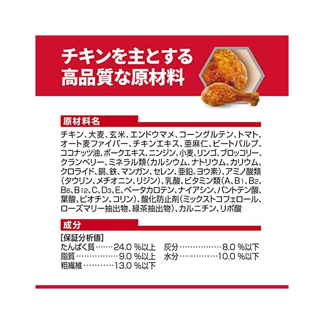 原材料:チキン、大麦、玄米、エンドウマメ、コーングルテン、トマト、オート麦ファイバー、チキンエキス、亜麻仁、ビートパルプ、ココナッツ油、ポークエキス、ニンジン、小麦、リンゴ、ブロッコリー、クランベリー、ミネラル類(カルシウム、ナトリウム、カリウム、クロライド、銅、鉄、マンガン、セレン、亜鉛、ヨウ素)、アミノ酸類(タウリン、メチオニン、リジン)、乳酸、ビタミン類(A、B1、B2、B6、B12、C、D3、E、ベータカロテン、ナイアシン、パントテン酸、葉酸、ビオチン、コリン)、酸化防止剤(ミックストコフェロール、ローズマリー抽出物、緑茶抽出物)、カルニチン、リポ酸