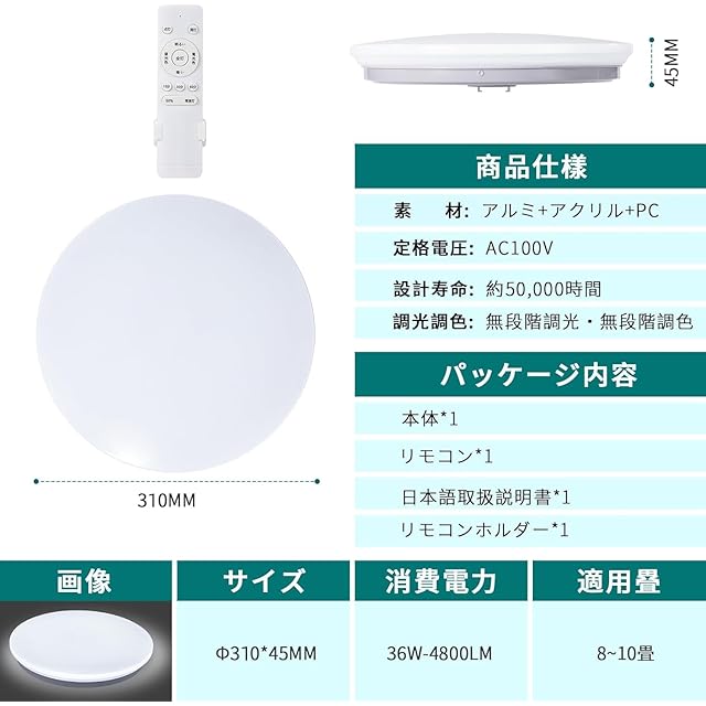 この LEDシーリングライトは、8畳の広さに最適な明るさを備えています。36Wの省エネ設計で、器具光束は4650lmの明るさを実現します。リモコン操作で、昼光色から電球色まで調光・調色が可能です。常夜灯モードやメモリ機能、15分/30分/60分のスリープタイマーも搭載しています。玄関、寝室、和室、台所、洗面所など、あらゆる場所で使用できる優れた天井照明です。PSE認証を取得しており、安全性もされています。日本語の説明書が付属しているので、設置や操作が簡単です。