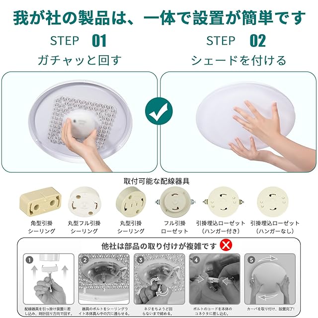 【取付簡単】このLEDシーリングライトは工事不要で、簡単に取付できます。説明書に記載である取付方法によって女性でも簡単に扱えます。コンパクト、軽量なシーリングライト、天井に対応な配線器具がある場合、電気工事・工具不要で簡単に取付できます。ご注意:未然に感電による外傷や障害の発生を防ぐため、取り付け/取外し前に電源をお切りください。