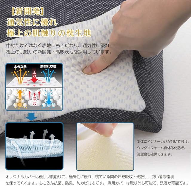【洗濯可能の枕カバー】肌触りがよく、通気性にも優れたこだわりのオリジナルカバーです。通気性・滑らかさ・クッション性の共存。抗菌・防臭処理も施し、洗濯機で簡単にお手入れ可能。※枕本体は洗濯不可。陰干しをオススメいたします。