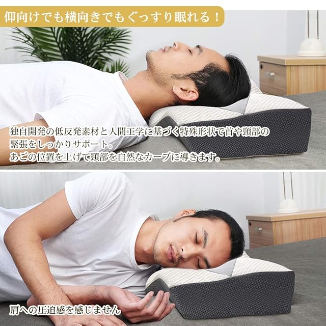 【凹型の中空設計】日本人の体型に基づいて設計された低反発枕です。凹型の中空設計により、頭が安定し、頭部への負担をかけず、まるで無圧力のような寝心地を実現。横向き寝の際の側頭部や耳のあっぱく感も感じない。肩と肩口のカーブにフィットするアーチ型形状で頭をのせるだけで自然なカーブに導き、首や肩もラクなんです。