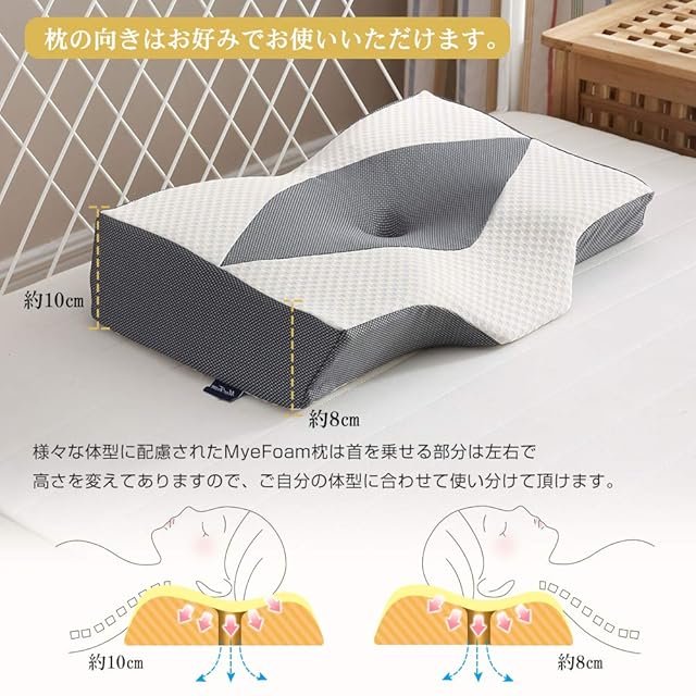 【仰向き 横向きでもラク、高さ調整可能】仰向けで寝る場合、中空設計+くぼみ形状により、頭部への圧力をかからず、寝姿勢を安定。 横向けで寝る場合、中空設計で横向き寝の際の側頭部や耳のあっぱく感を感じない。 様々な体型に配慮されたMyeFoam枕は首を乗せる部分は左右で高さを変えてありますので、ご自分の体型に合わせて使い分けて頂けます。