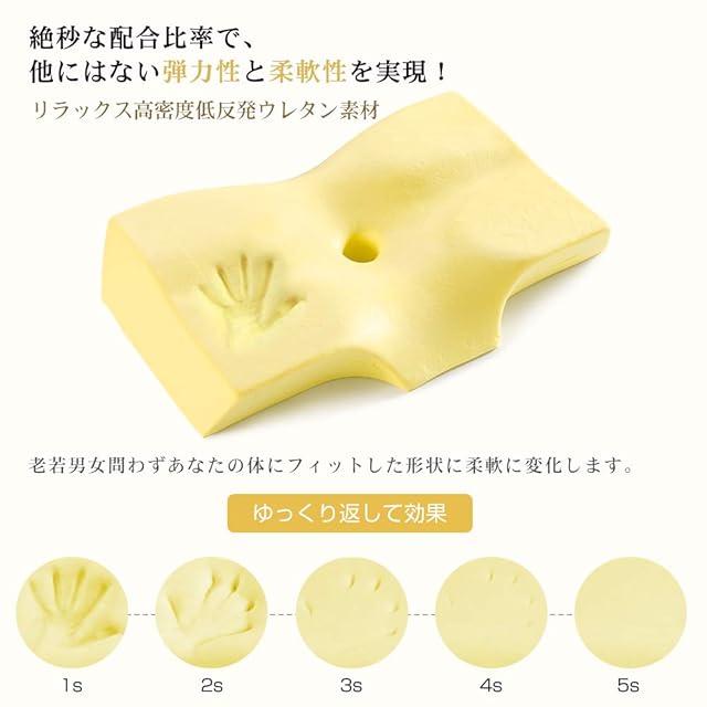 【低反発素材 安眠枕】フィット感を追求し理想の固さを実現し、リラックスさせるウレタン素材を採用。ゆっくり頭の形に沿って沈み込み、包み込むようにやさしくフィットしていきます。独自の立体形状と快眠素材でどんな寝姿勢でも首・肩に負担をかけずに自然な首のカーブを支える。