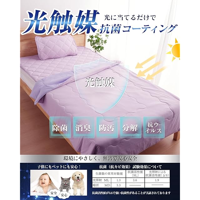 【最新技術光触媒【除菌】 【抗菌】 【消臭】】光触媒とは、太陽光や蛍光灯のような光に反応し、一般細菌類・悪臭・カビ・有害な化学物質などを分解し、無害化する働きがあります。湿気や汗から出るニオイや細菌の心配もありません。いつでもひんやり肌掛け布団を清潔にお使いいただけます!