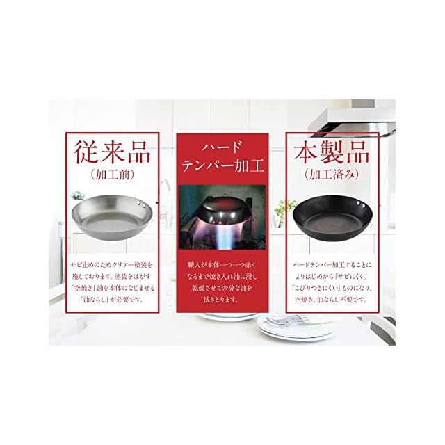 職人がこだわった本格仕上げで「こびりつきにくく」「サビにくい」フライパン 鉄(26cm)です。独自の加工方法の『ハードテンパー加工』で、使いはじめの使いにくさ解消。使い込めば使い込むほど油なじみが良く焦げ付きにくくなり、長く使うほど愛着がわきます。