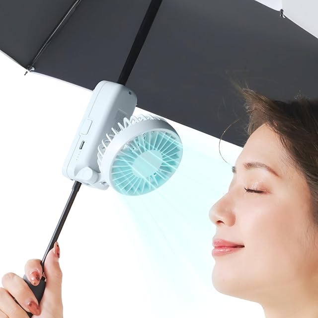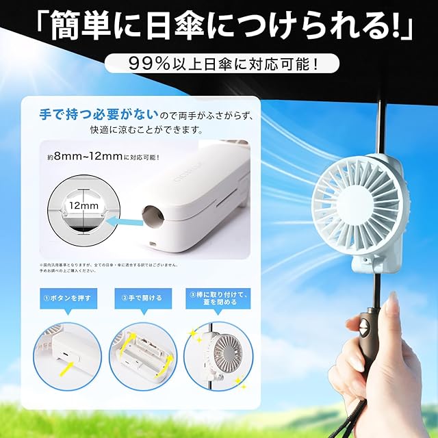 【日傘に取り付けて使える携帯扇風機、新登場!】蒸し暑い真夏を快適に過ごすには欠かせないアイテムと言えば、携帯扇風機ですね!本製品は日傘に取り付けて使える携帯扇風機です。日傘を使用する際に手がふさがって扇風機を使えない不便はもうなし!本製品で夏を快適に過ごしましょう。