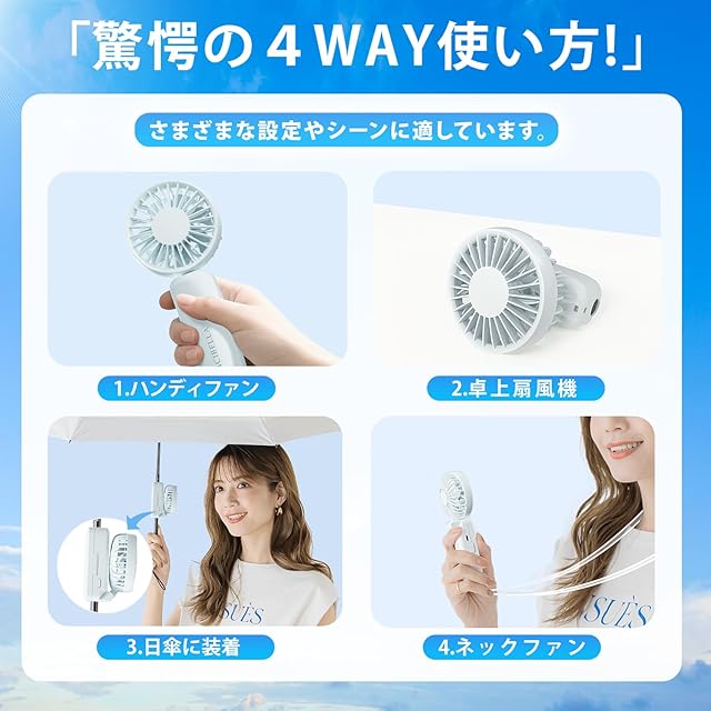 【180° 上下角度調整可】本商品は180°に上下角度調整可能です。ハンディファンや卓上扇風機としてご使用の際に、お好みの角度に調節しご使用いただけます!その際、送風部分の角度調整可能です!様々な用途でご使用いただけるので、1台あるだけでこの夏大活躍!外出時はもちろん料理・勉強・リラックス時間の時でもご使用可能なので暑い夏をより快適にお過ごしいただけます♪また、贈り物としても最適です!