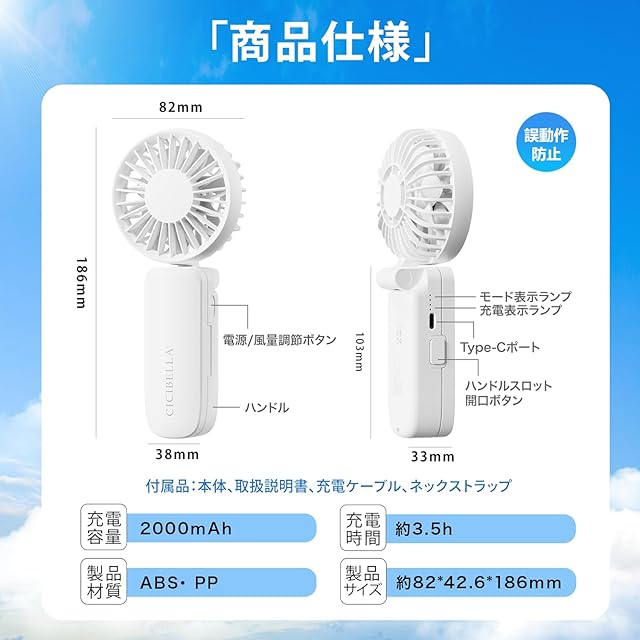 【メーカーによる一年安心保障】メーカーから一年間の商品を提供します。商品について何かございましたら、いつでもカスタマーセンターへご連絡ください。パッケージ内容:扇風機本体×1、ネックストラップ×1、USBケーブル Type A-C×1、取扱説明書×1
