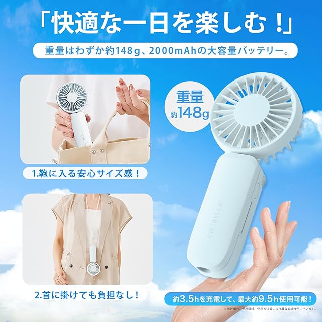 【サイズ】約8.2×4.2×18.6cm 重さ:約148g(軽量設計) 風量切替:3段階 稼働時間:/弱_約9.5h/中_約4h/強_約2h 充電時間:約3時間(電源OFF状態) 入力端子:USB Type-C(AtoC/CtoC充電対応) 使用電源:リチウムイオン電池 2000mAh(寿命充電回数約400回)