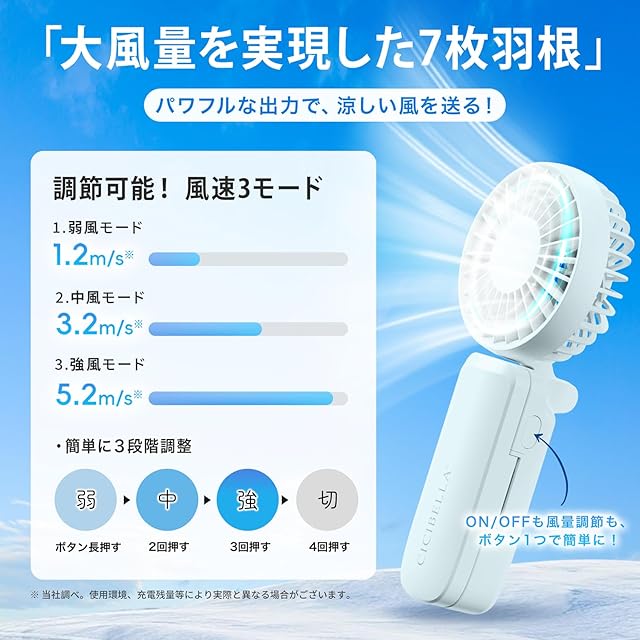 【3段階風力調節・コンパクトでもパワフル送風!】小型ながら驚きの風量を実現!風量は弱・中・強の3段階で、ボタンひとつで簡単に調節可能。シーン合わせて風量を調整いただけます!