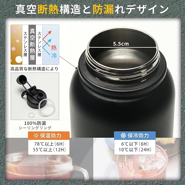 【漏れ防止で安心】 密閉性の高い蓋により、バッグの中で漏れる心配がありません。通勤や通学、アウトドアでも安心して持ち運べます。保温・保冷機能と合わせて、快適な使用感を提供します。