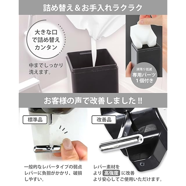 【片手で簡単操作】ただレバーを引くだけのシンプルな設計で、片手で簡単に操作可能です。 1回での吐出量は一般的なボトルタイプと同じ約2-3mlです。レバー式でお好みの量に簡単に調整可能です。