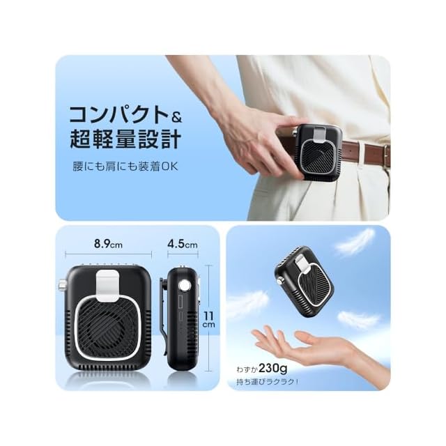 ✅【軽量&コンパクト - 持ち運びラクラク設計】重さわずか230g、手のひらサイズのコンパクト設計な 携帯扇風機 。サイズは8.9cm × 4.5cm × 11cmでバッグにもすっぽり収まります。さらに、リストバンドやストラップが付属しており、持ち運びが便利。スポーツ観戦や通勤、イベント会場など、どこでも手軽に使える万能 ポータブルファン です。