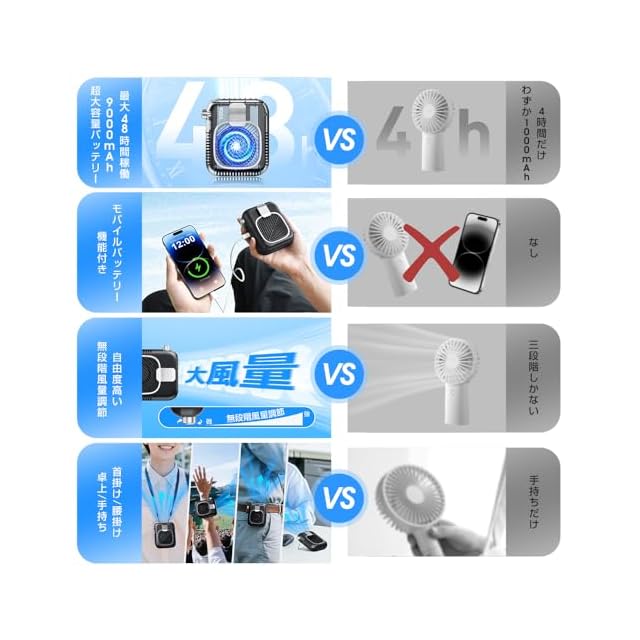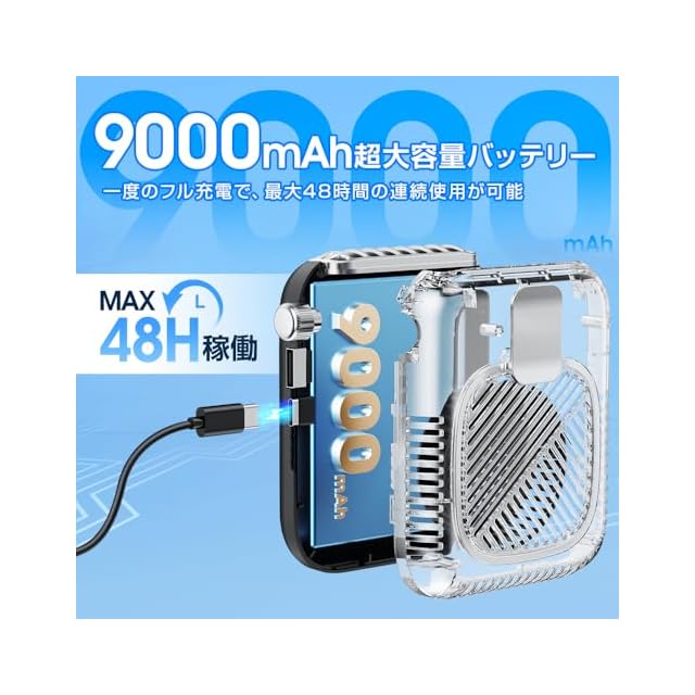 ✅【9000mAh超大容量バッテリー - 最長48時間連続使用】 ポータブル扇風機 が9000mAhの大容量バッテリーを搭載し、一度のフル充電で最長48時間の連続稼働が可能な せんふうき扇風機 小型 です。さらにUSB出力ポート付きで、スマートフォンやタブレットへの充電も対応可能な 腰ベルト扇風機 。アウトドアや旅行先でも電源切れの心配なし。これ一台で ぶら下げ ファン としても モバイル 扇風機 としても活躍します。