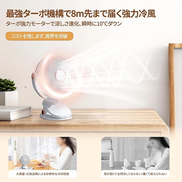 【卓上扇風機・クリップ・壁掛3つの使い方】これですクリップ式卓上扇風機は手動で左右上下に360度の調整が可能、どんな向きにも涼しい風を届けてくれます。クリップの力が強くて、落ちにくいデザイン、直径は約3-5cmまで固定可能、クリップ式で場所の制限がなく、卓上、車中、ホーム、オフィス等いろんなところで使用可能です。机の端を挟んでスペースが取らず、非常に使用便利、クリップ+コードレスでアウトドアにも大活躍。また、クリップの底部には壁掛け用フック穴があり、壁に掛けてもご使用いただけます。長押しすとる電源OFF、いちいち最後の風量モードまで押す必要がありません。エアコンと併用すれば、設定温度を抑えられるので節電につながり、一年中ご利用いただけます。