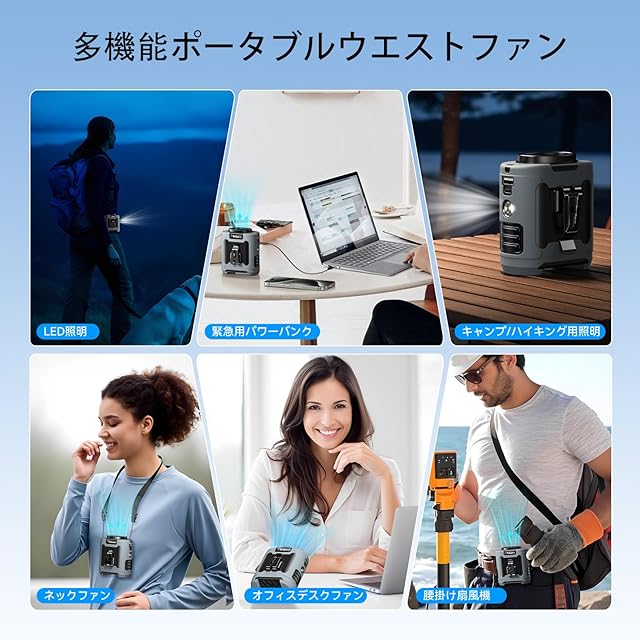 ベルトファン 携帯扇風機 最大30Hまで使用可能 首掛け・腰掛け・卓上置き 6段階風量調節 腰ベルト扇風機 静音 ミニ 扇風機 10000mAh 携帯電話などの緊急充電が可能 キャンプ / トレッキング / 屋外作業など適応