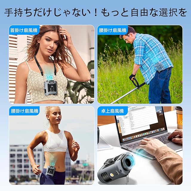 【4in1多機能設計で実用性抜群】 わずか290gの軽量設計で、腰に装着するだけでなく、首にかけて使用することもできます。ダブルクリップ設計は従来のベルトファンよりも安定しており、落下や移動を心配する必要がありません。ブラケットを開いてデスクトップに置くと、デスクトップファンとして使用できます。通勤、花火大会や祭り、スポーツ観戦など、さまざまなシーンで手持ちで使うこともできます。