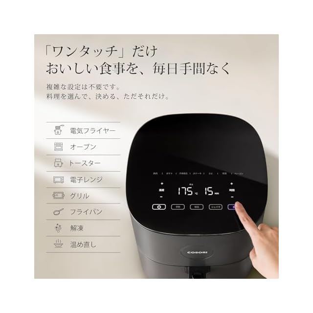 【豊富な調理モード】高級感のあるタッチパネルで簡単に操作できます。鶏肉、ポテト、冷凍食品、ステーキ、魚、野菜、ベーコンなど、9種類のプリセットが用意されています。調理時間は最大60分まで設定でき、温度は最大230℃まで調整できます。当ページでは取扱説明書(ユーザーマニュアル)と特製専用レシピ(ユーザーガイド)をダウンロードできますので、ぜひご活用ください。家族や友人へのプレゼントとしてもおすすめです。